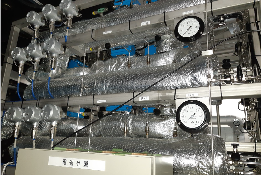 平滑な溶接サニタリー配管当社ではドイツ/ポリスード社製のサニタリー配管製作用の自動溶接機を8台導入し、医薬・製薬プラントなどの厳格な管理の下での配管製作の要求にも対応可能。大量の受注にも応えられる。配管自動溶接においては、独自の工夫(特許出願中)により配管円周方向で均一で、かつ凹みのない平滑な溶接を得意としている。また、医薬プラント製造においては薬液の流れを考慮して微小な角度を設け、液溜まりのない配管敷設を行う。